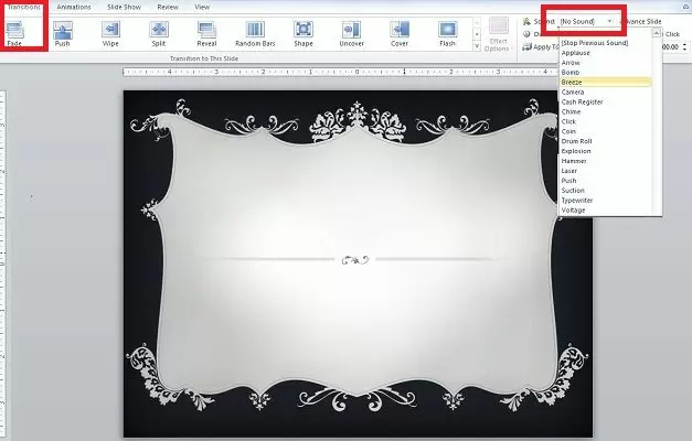 There are several sound effects for slide animations that come prepackaged with PowerPoint 2010. Office PowerPoint 2010 offers a variety of sounds to really talk to your audience, with slide transitions of your presentation. If you have applied a Slide transition effect, you can also pick a sound effect which more suites with the applied transition effect. For adding sound with slide transitions, open presentation slide and navigate to Transitions tab, under Timing group, from Sound options, select a desired sound. You can choose between a preset of sound effects to choose every time you move to the next slide.