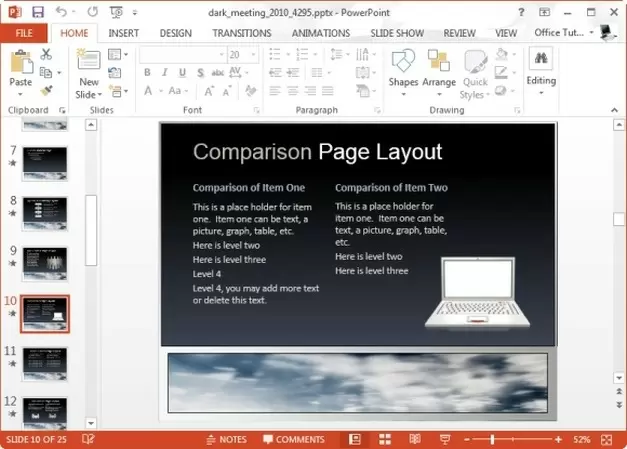 The Dark Meeting template offers a variety of slide designs including sample slides with editable charts, picture layouts and clipart.