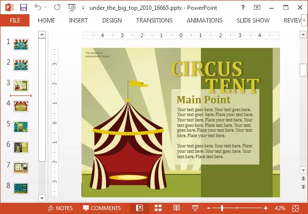 If you need to make a presentation on a topic about a circus or carnival or need to depict illustrations which can signify fun, you can use the Animated Carnival PowerPoint Template given below. The original name of this template is Under the Big Top. The central theme of the template is based on animated layouts with illustrations depicting characters you would usually find in a circus or carnival.