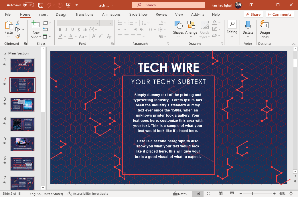 You can even design infographics or create lists, comparisons, insert charts and SmartArt, etc. There is ample scope for customization in this template and the user can make use of the futuristic background to discuss anything from presentations about technology to a pitch deck with a unique tech-based investment initiative.