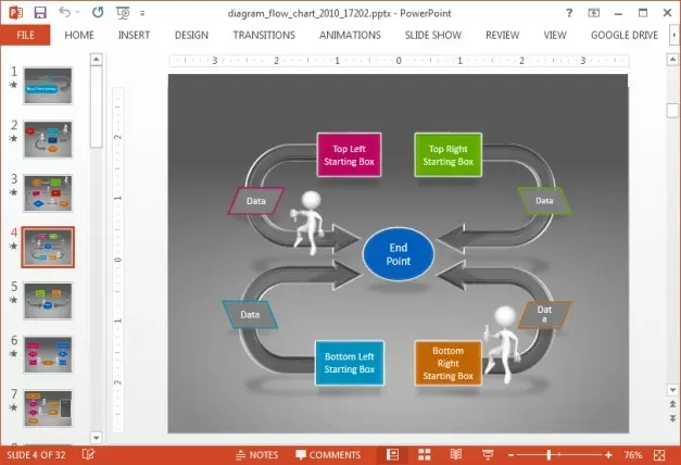 If you want to make flowcharts with ease and grace, the Animated Diagram Flow Chart PowerPoint Template is all you need. This presentation template provides a number of sample flowchart slides which can be edited for making custom charts.