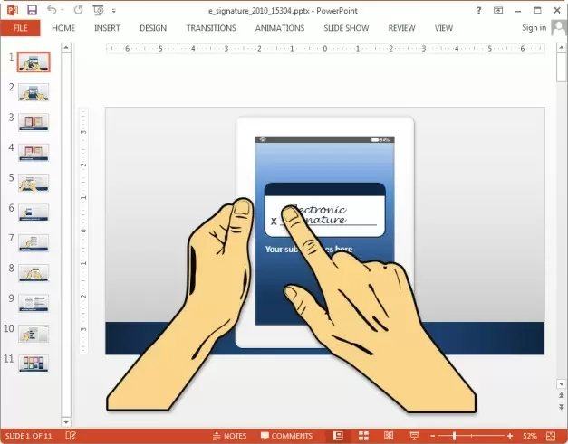 The Animated Electronic Signature Template for PowerPoint provides slides depicting an electronic signature being unlocked with a finger swipe. The template provides animations, clipart and a variety of useful layouts suitable for making presentations related to technology, electronic signature verification, BOYD (Bring Your Own Device) initiatives, etc.