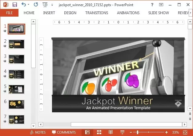 The template starts with a slot machine animation. The animation stops at a ‘jackpot’, with the title ‘winner’ labeled on top of the machine. You can edit this title and replace it with your presentation topic.