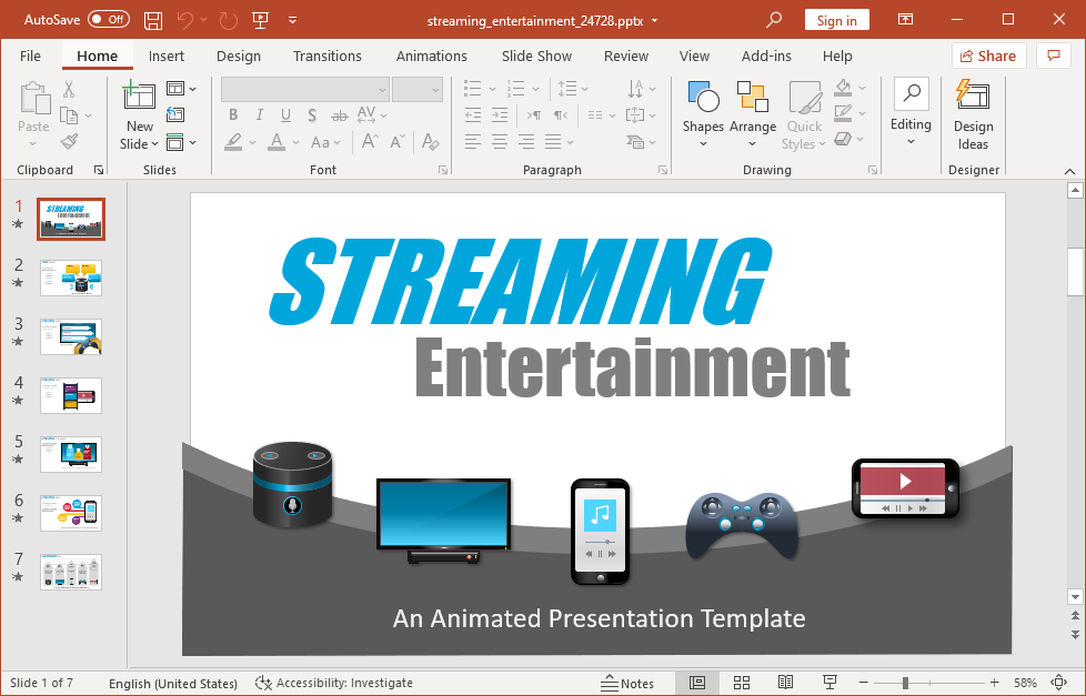 Originally titled Online Streaming Entertainment, this PowerPoint and Keynote template contains slides depicting media streaming devices capable of supporting animated media streaming services. There can be a number of benefits of using these slides. Ranging from making slide decks about a target market to school presentations discussing the rise of media streaming services and devices.