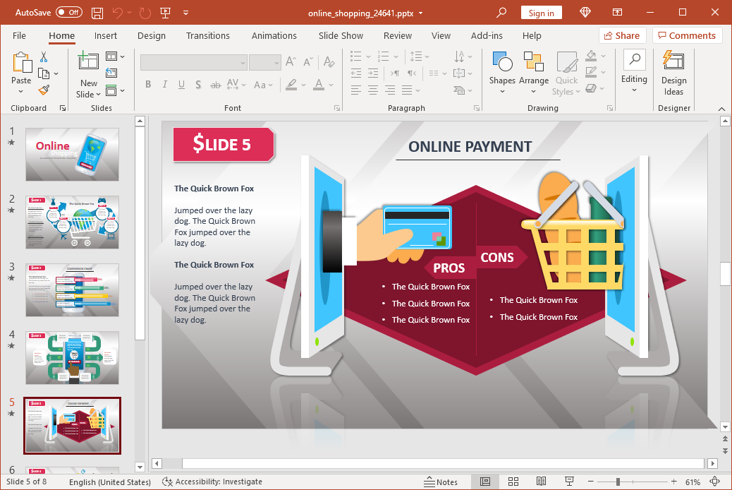 When discussing m-commerce, it is also important to understand the layouts and ease of accessibility that customers might have when using your platform. Perhaps this is why the animated mobile presentation template contains several slides that focus on selling and purchasing goods using mobile devices. This is why it makes a good template for online shopping and e-commerce.