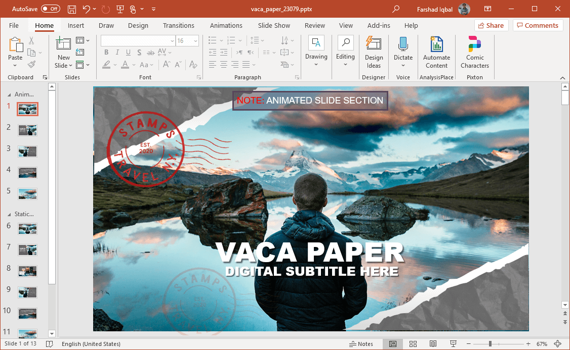 Making a presentation look different and visually appealing can help you score some points as a presenter. How about making your slides look like a postcard? Vaca Paper is a presentation template which gives a vacation postcard like look. This Animated Postcard PowerPoint Template comes with replaceable images.