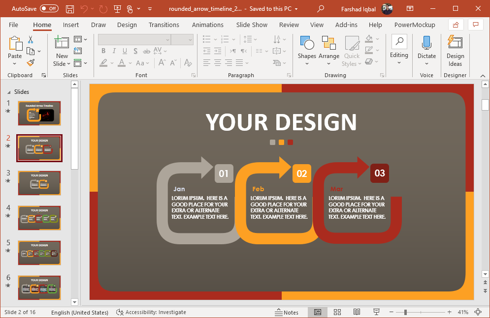 Timeline PowerPoint templates can help save time in creating timelines for presenting historical information, trends, forecasts, project milestones, etc. The Animated Rounded Arrow Timeline for PowerPoint gives rounded timeline slide designs with arrow shapes and editable slide elements.