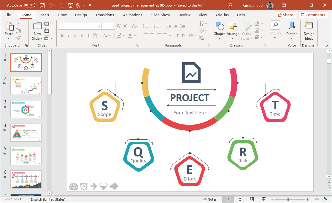SQERT is used in project management to take a look at the scope of the project, the quality standard, effort involved, risk and delivery time. Animated SQERT PowerPoint Template can be used for making SQERT diagrams using animated slides to discuss a project and its associated variables.