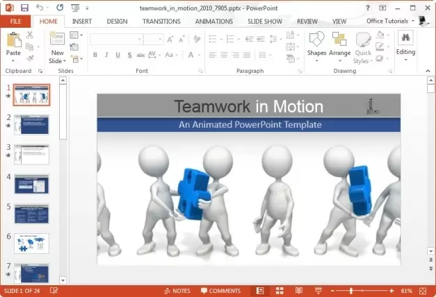 This is an interesting PowerPoint Template with an animation of stick figures working together to pass puzzle pieces. You can download this template in Standard or Widescreen format; both versions contain animated slides that are highly customizable, with charts, teamwork themed clipart and more.
