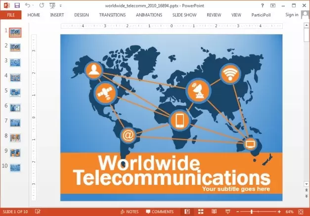 This communication PowerPoint template provides animated communication and telecom themed slides with world map illustrations. The objects in slides are editable and you can easily resize, recolor and rearrange them.