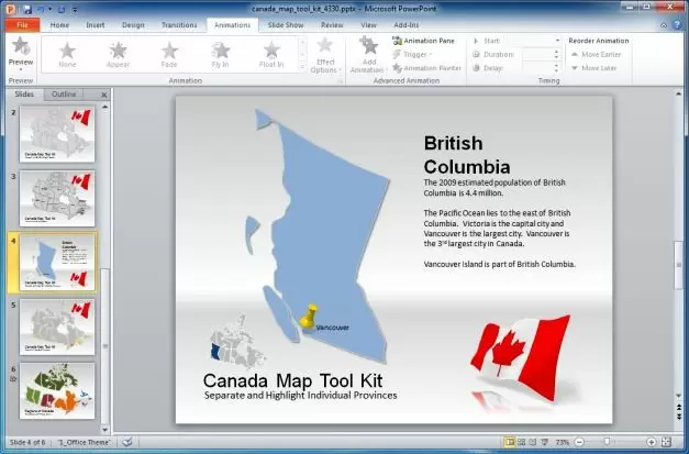 Maps are always a good way to project business reports for revenue and sales forecasts, potential markets, consumer trends, etc. Previously, we brought you the review for the Widescreen World Map Toolkit and the Europe Map Toolkit. These Animated PowerPoint Templates are map templates that come with editable sample slides for making custom presentations which may require the use of maps. Canada Map Toolkit Template for PowerPoint is another animated template, which comes with a fully editable map of Canada and its Provinces.