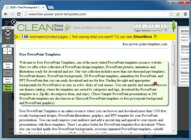 CleanPrint provides a real-time preview of the printable content to help you avoid wasting printer ink or paper. It shows the amount of pages that will be required to print the selected webpage and also makes it possible to remove unwanted areas before printing the page. As you remove sections from the print preview, the estimated page count for printing the content also changes.