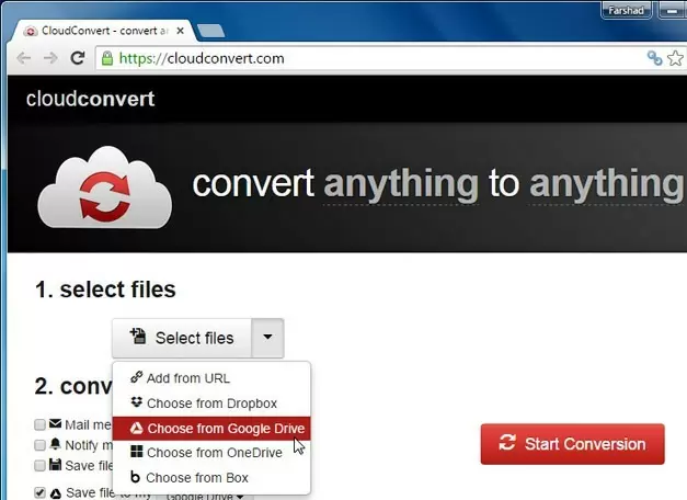 You can save your files not only in supported cloud storage accounts but also to your CloudConvert account. Moreover, you can also get the converted file emailed to you. Click Start Conversion to initiate the conversion process.