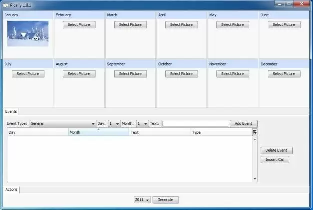 Ever wanted to make your own personal photo calendar with those beautiful wallpapers you collected from the web? Pically is a free software for making photo calendars by simply adding images for each month of the year. It is a cross-platform application with versions for Windows, Mac and Linux computers and comes with the most simple options for generating personalized photo calendars. Pically is a portable application, which means that it requires no installation. In case you require calendar templates for PowerPoint for creating presentations, see our free PowerPoint Calendar Templates.