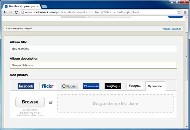 You can fetch images from a wide range of social media websites such as; Facebook, Instagram, Flickr, Picasa, SmugMug, Photobucket or import images from your computer. Before adding images, make sure that you have given your album a title and description.