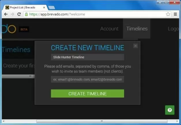 Timelines created with Brevado have a reasonable appearance and can be considered as professional looking, especially due to the fact that they come with the utility of adding videos, files (e.g. MS Word, PowerPoint or other types of files), notes and comments. To get started, sign up for a Brevado account and click Create New Timeline.