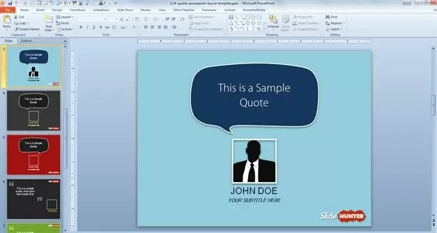 As you can see below, this free quote template for PowerPoint comes with custom layouts for presentations. You can easily switch to another layout using the layout menu. In this case, the layout can be changed to use a different background color, fonts or presentation layout. Are you curious about what is a PowerPoint layout? Here you can learn more: PowerPoint help on what is a PowerPoint slide layout.