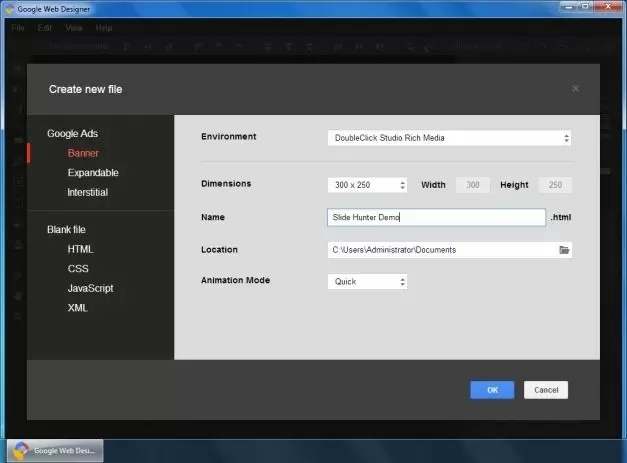 Google Web Designer supports HTML, CSS, JSON, JavaScript and XML. You can start off by either creating a new project or importing an existing file from the aforementioned formats.