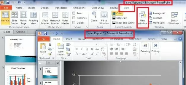 PowerPoint allows opening the same document in two windows. This feature let you open a new window containing the information of first presentation file. In order to use this feature, open ‘View’ from menu on top and then go to ‘New Windows’ button. This is a very powerful and interesting feature that enables users to edit a PowerPoint presentation while seeing it in action in second window. If you have another monitor, you can move the second window to the secondary monitor and edit it while checking how the final presentation looks.