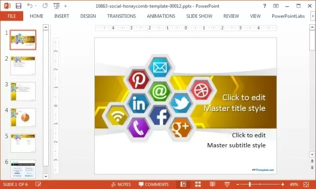 This is another social media plan template with a honeycomb design that can be handy for presentations related to social media. The glossy graphics make the template stand out and the text in white is well-placed to ensure that your added content is legible.