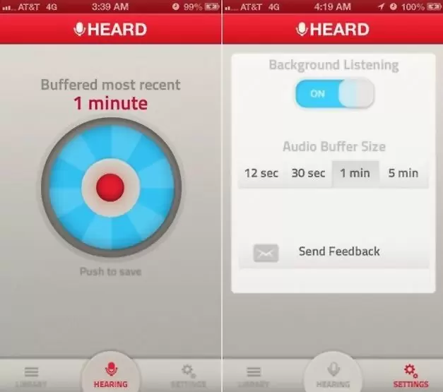 Unlike conventional apps like Recordium, this app does not record audio of everything but instead it runs in the background and lets you decide if something should be saved, including content captured five minutes ago. Basically, HEARD starts a buffer period after it is launched. It records for the buffer duration and discards the rest of the recording, unless you specify it to save some parts of the recorded content. By default the buffer period is just 12 seconds, however, you can purchase a bigger audio buffer by making a $1.99, in-app purchase. The purchased buffer period is then enhanced to 5 minutes.