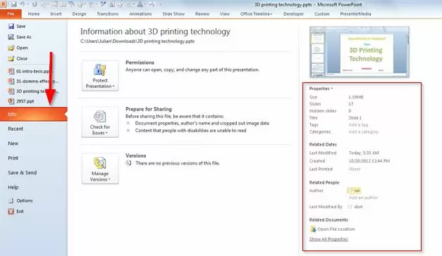 Also, notice that the properties and meta data are also displayed in other sections including the File Explorer if you right click over the .PPT file and choose the properties. There is a tab with Details as you can see in the figure above. This approach also works for other MS Office documents including Word and Excel.