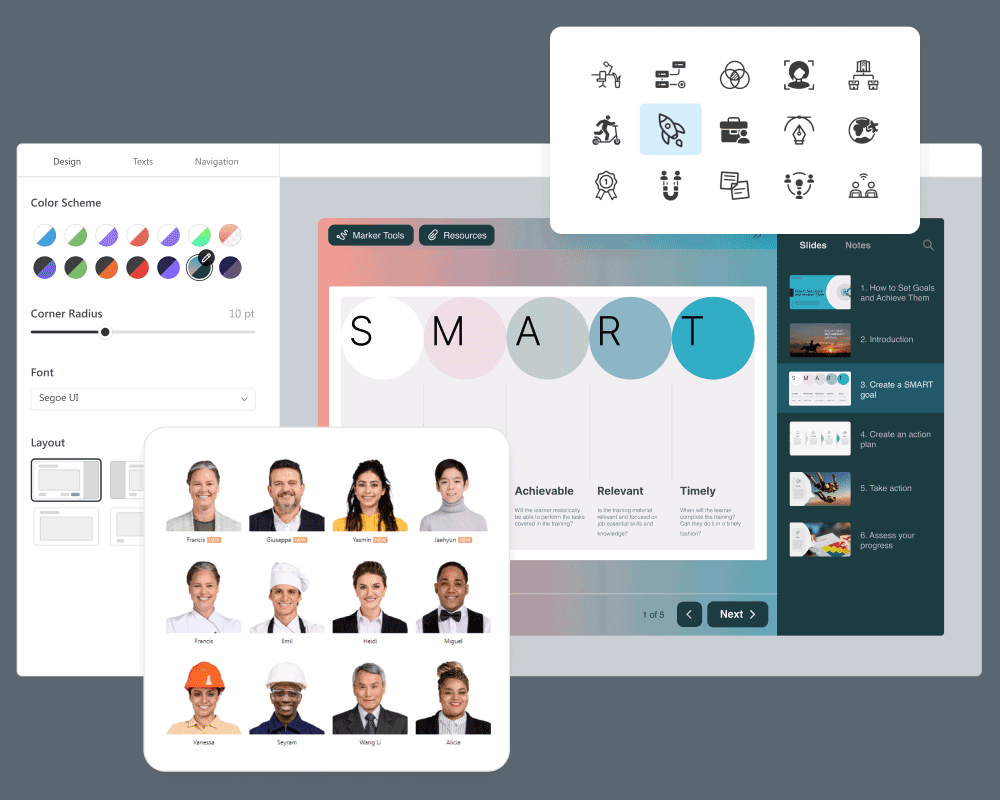 With all these resources at your fingertips, there’s no need to spend time searching for suitable images or infographics on stock photo websites. Instead, you can focus on what matters most and build immersive courses several times faster.
