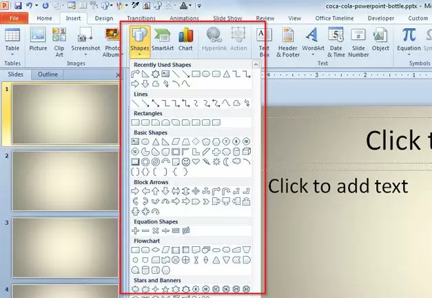 To insert a shape in PowerPoint 2010 just go to the Insert menu and then look for the Shapes button. Once you press this button a new popup will appear on the screen where you can pick the shape to be inserted.