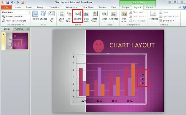 Click on ‘Layout’ Tab, and there are more options. There are option other than Chart Tools options like ‘Insert’, ‘Label’, ‘Axes’, ‘Background’, and ‘Analysis’ options. User can insert pictures from computer, put shapes of different sorts on the image, and a text box on the active PowerPoint chart with ‘insert’ option. Whatever is inserted is simply put over the chart and within the borders of the selected chart.