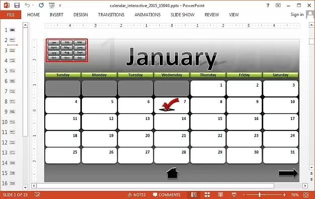 Interactive 2015 Calendar Template for PowerPoint provides exactly what its name suggests, i.e. a presentation template with interconnected, interactive slides, which make it easy to switch between different months in a single click.