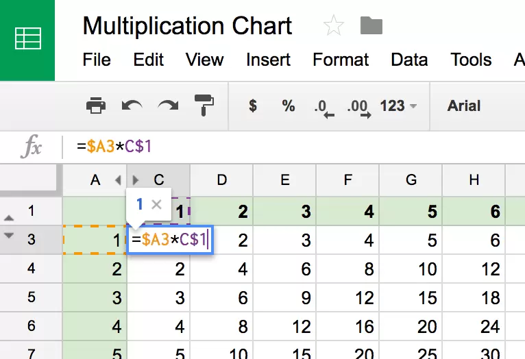 The following screencast will show you how to create this simple multiplication chart using Google Sheets. For this example we are creating a multiplication chart with numbers from 1-100 (also known as a Math multiplication chart 1-100). But using the same approach it could be possible to create a multiplication chart 1-12.