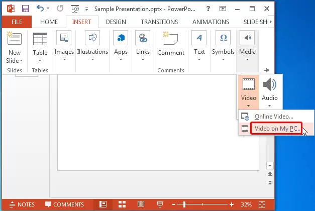 Step 1: Insert video to your slide. You can do this by either dragging and dropping a video to a slide or go to Insert –> Media –> Video and select a video.