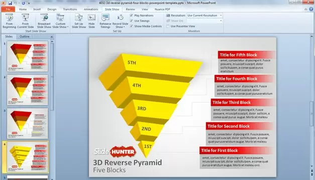 You can download this free 3D reverse pyramid template to model hierarchical data using PowerPoint. The template comes with four unique slide designs containing 3D pyramid with four steps and five steps and stages.