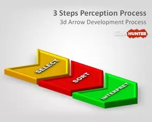 Free 3D Three Steps PowerPoint template with Perception Process is a free template for PowerPoint presentations with a 3D process flow diagram including arrows and legend with text boxes where you can edit or describe the process steps.
