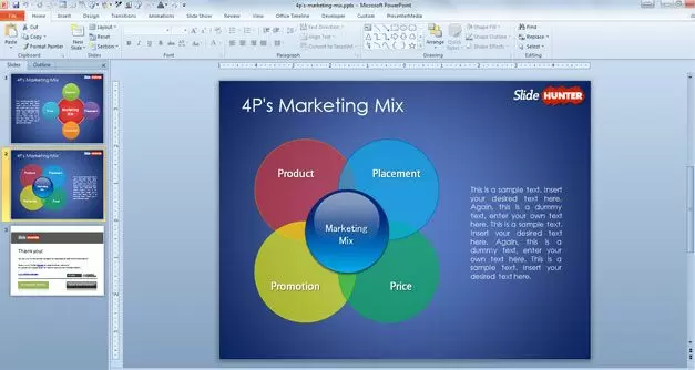 You can download this free marketing PowerPoint presentation template including two unique slide designs with marketing mix diagrams. Inside this marketing PPT template you can find a diagram combining the four key concepts: price, placement, product and promotion.