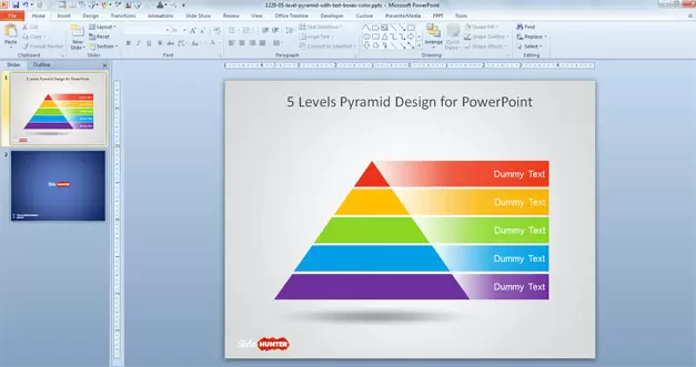 The pyramid PPT design with five levels is a layered diagram with multiple colors assigned on each level. You can easily customize the colors of this pyramid template by changing the color palette or assigning new colors from the Standard Color palette in PowerPoint.