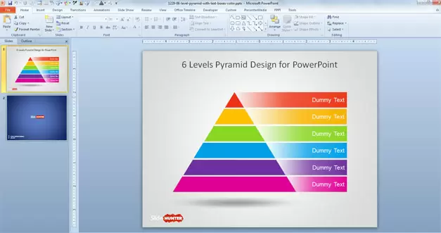 Free pyramid template design for PowerPoint with six segmented level diagram. This hierarchy pyramid presentation template with a segmented pyramid diagram and multiple levels (6 levels) can be used to represent a business concept or idea with different stages and levels.