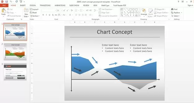 Awesome chart concept for PowerPoint is a simple but useful area chart template for Microsoft PowerPoint presentations with arrows that may be helpful to describe a process or trend showing a chart. The figure below shows two useful slides from this free area chart PowerPoint template that you can download for your PPT presentations.
