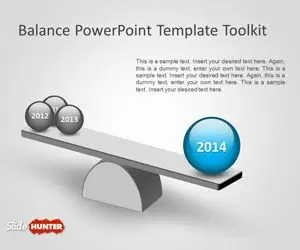 The balance template for PowerPoint contains different vectors and illustrations that you can use to make comparison and show a trend. For example the sign dollar or the spheres with years (that you can edit) can be good assets for your presentations. You can copy and paste your own illustrations and put them on the balance.