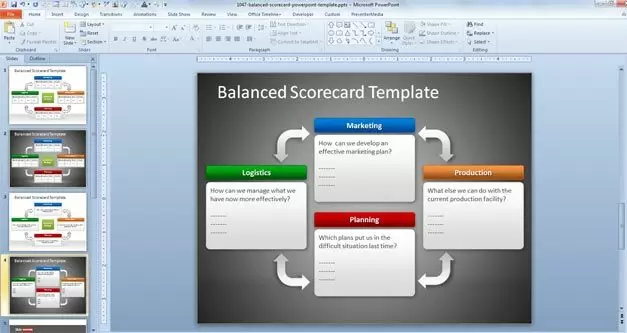 Free Balanced Scorecard PowerPoint Template is a BSC PPT template that you can use for corporate strategy and presentations on business. This free PPT template is compatible with Microsoft PowerPoint 2013 and 2010 but you can also use the Business Balanced Scorecard PPT template in PowerPoint 2007.