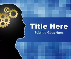 This slide design has a brain PowerPoint template with gears in the head and a blue background.