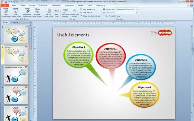 Free business agenda slide design with pointed text circles is a free PowerPoint design for presentations that you can use to represent different ideas, topics or even business goals in a single slide.