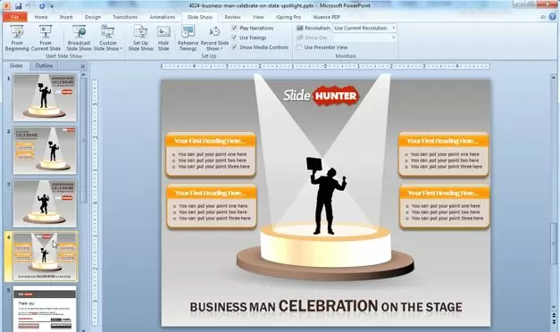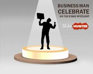 Free business man template for PowerPoint with a spotlight effect created with PPT shapes. You can download this free spotlight PowerPoint template and design for PowerPoint presentations to decorate your slides and showcase a product, highlight an important feature of any product as well as mention an important event or reach a milestone with your strategy goals.