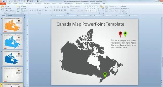 Free Canada Map for PowerPoint can be useful to make business presentations with Canada maps as well as other global presentations or online meetings. You can use the geo location pins to tag any desired location in a map and then measure the distance between two points or decorate your trading PowerPoint presentations with awesome maps of Canada.