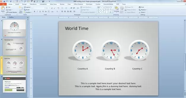 The template is useful if you need to present an analog clock to an audience. Since the clock shapes are fully editable, you can adjust the time in PowerPoint (adjusting the red needles) and display any desired time in hours or minutes.