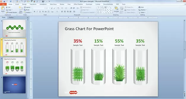 In the figure above you can see we have used a container with grass inside to represent the percentage levels. You can replace the grass shape to use any other graphic or cool shape more relevant to your industry or presentation needs. In this case, seems the grass shape is suitable for any botanical PowerPoint presentation as well as agriculture slide designs.