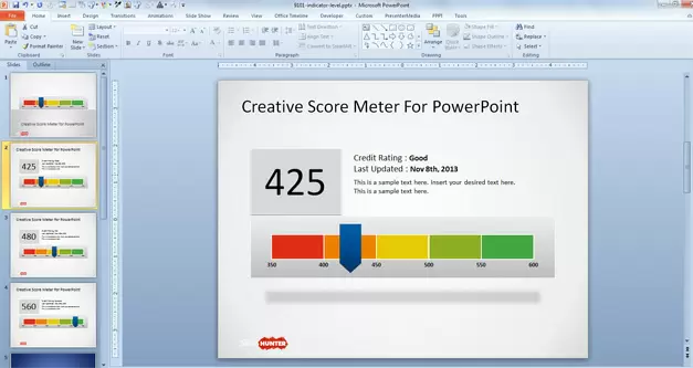By customizing the values and placeholders on this PowerPoint template you can create awesome credit score presentations using PowerPoint. In order to customize the needle you just need to select the needle using PowerPoint and then move to any desired location. Unfortunately the value is not updated automatically but you can easily edit the number to enter any other desired value.
