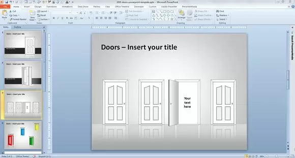 Inside this doors template for PowerPoint 2010 and 2007, you will find different slides with doors shapes that you can use in your presentations. You can copy the door pictures to your PowerPoint presentations. This doors template contains different doors styles, for example colorful doors or painted doors as well as other status including opened door image or closed door picture. You can insert text inside the door and use the doors shape to make decision PowerPoint presentations.