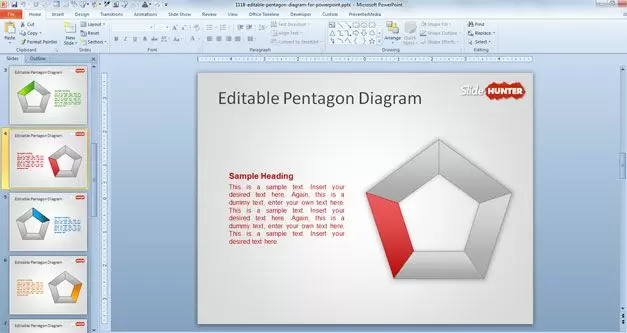 One of the editable pentagon slides contains multiple segment colors with text placeholder that you can edit for your own business presentations. For example, the pentagon PowerPoint slide design can be helpful to prepare awesome business models using five sides.