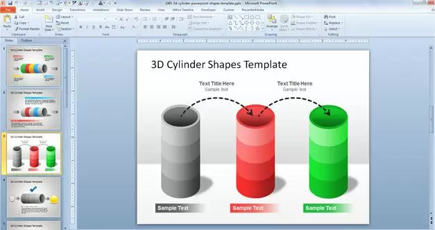 Los cilindros 3D fueron creados con formas de PowerPoint y utilizando distintas combinaciones de colores y efectos, obteniendo una figura muy atractiva visualmente y que puede ser empleada para crear presentaciones profesionales de PowerPoint con recursos gratis.